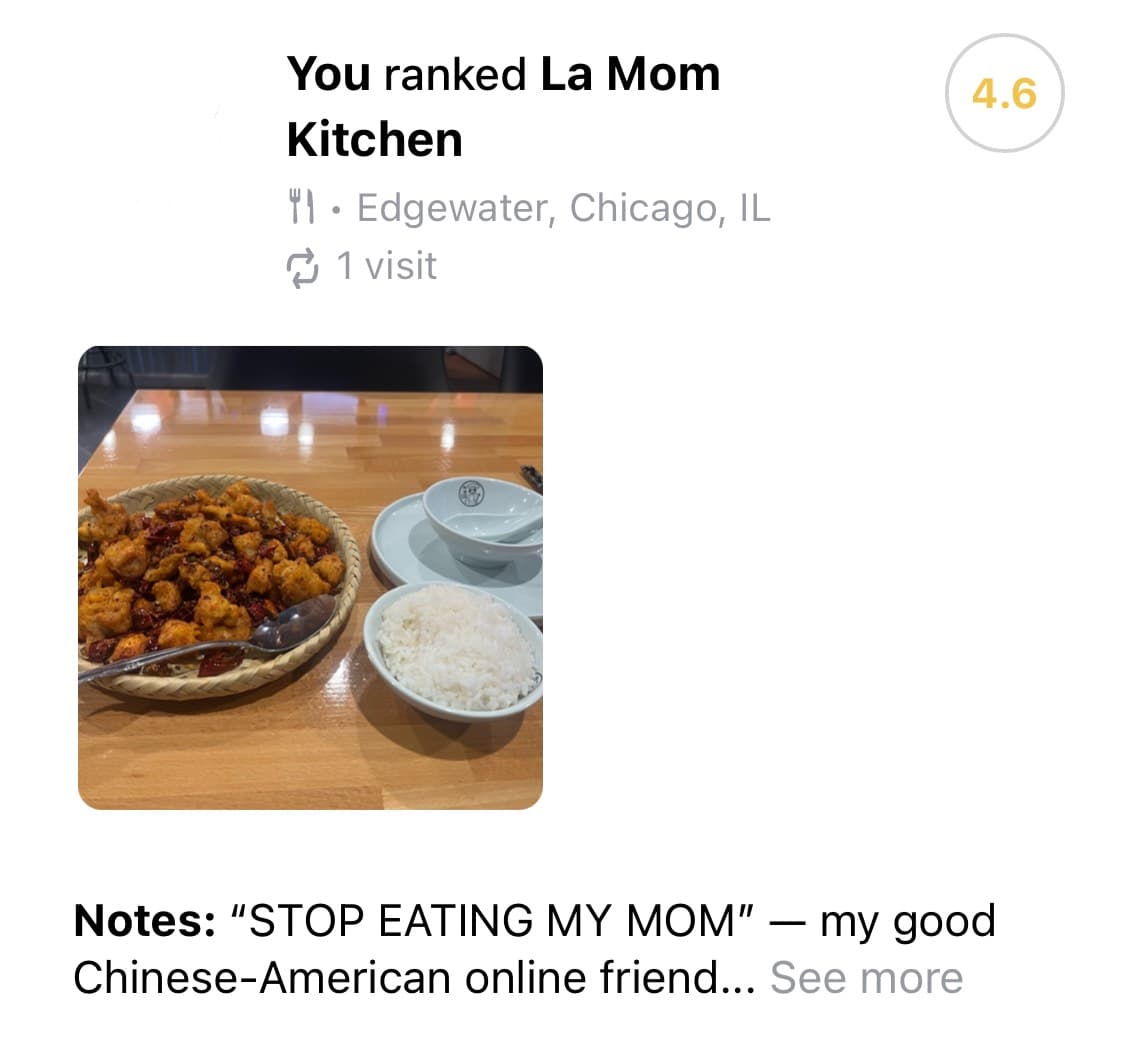 I wasn’t much of a food photographer myself until my piano club’s Discord server created a channel just for food. Then people started posting pictures and I went, might as well join in! I’ve also been taking more pictures thanks to the Beli app, which I use to rate and review restaurants ![]()