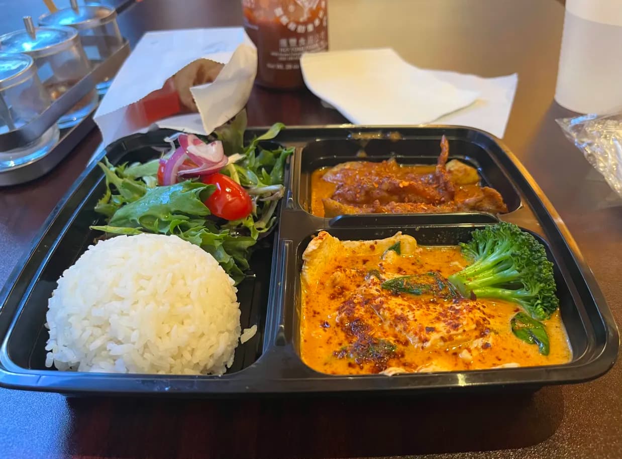 Got the $13-ish satay chicken and panang chicken lunch special. They asked me to select between four spice levels: mild, medium, American spicy, and Thai spicy