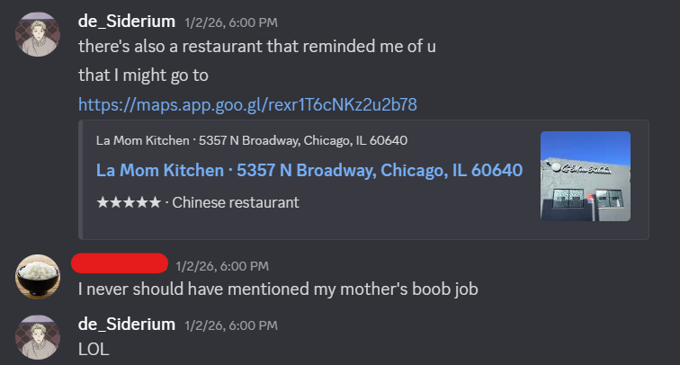 For context, I have an online friend whose profile picture is a bowl of rice. I don’t quite remember how we ended up being as close as we are, but we’re close enough to have several (cursed) inside jokes. The latest additions to those jokes involve my friend’s mom.