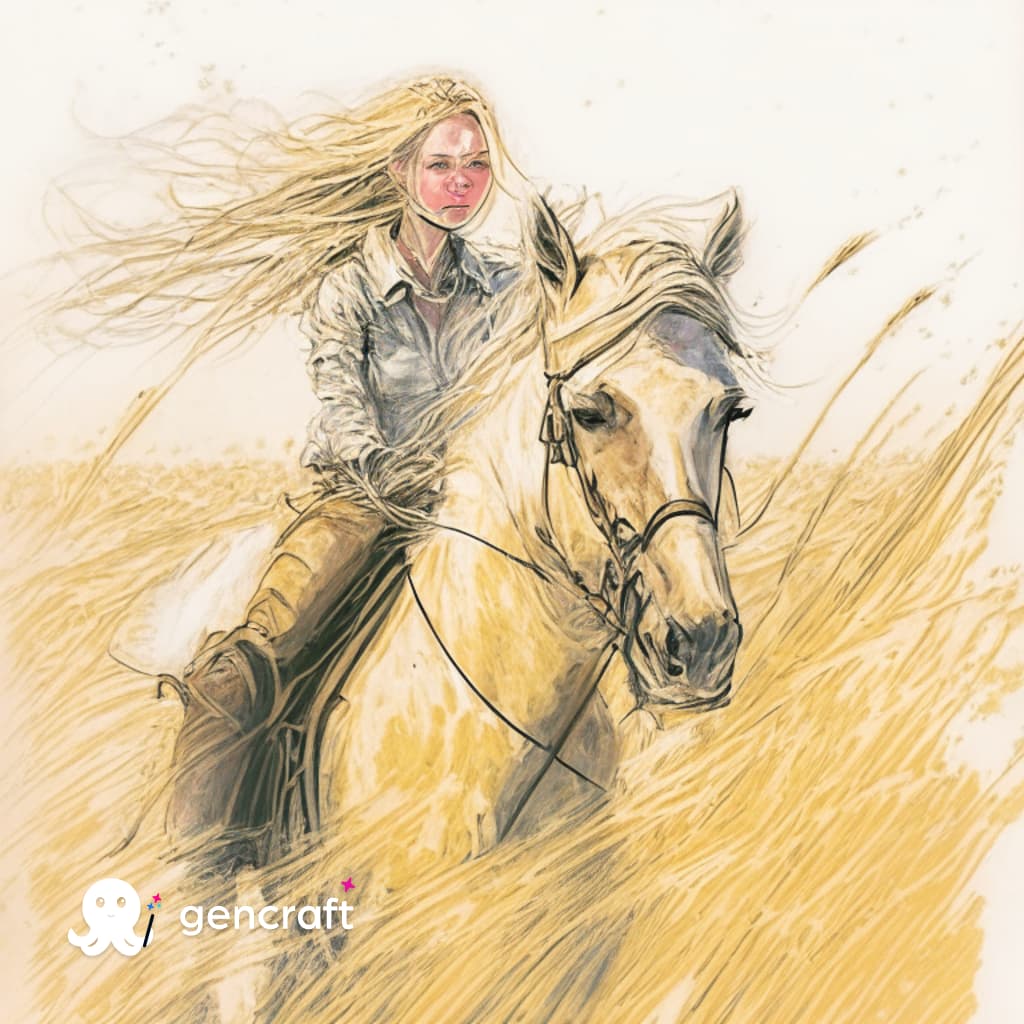 Dirty Blonde girl with golden skin riding a horse in a wheat field. Chose style “Watercolor”