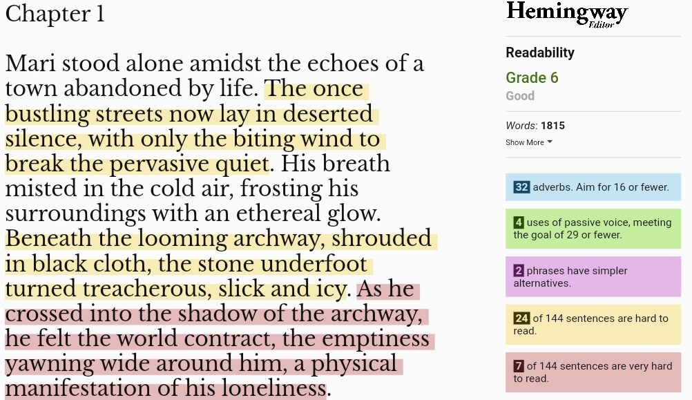 I’m always extremely skeptical of Hemingway, to the point where I tell writers not to do it because it removes the critical thinking/analysis part of editing and makes people go on autopilot, but a few different excerpts: