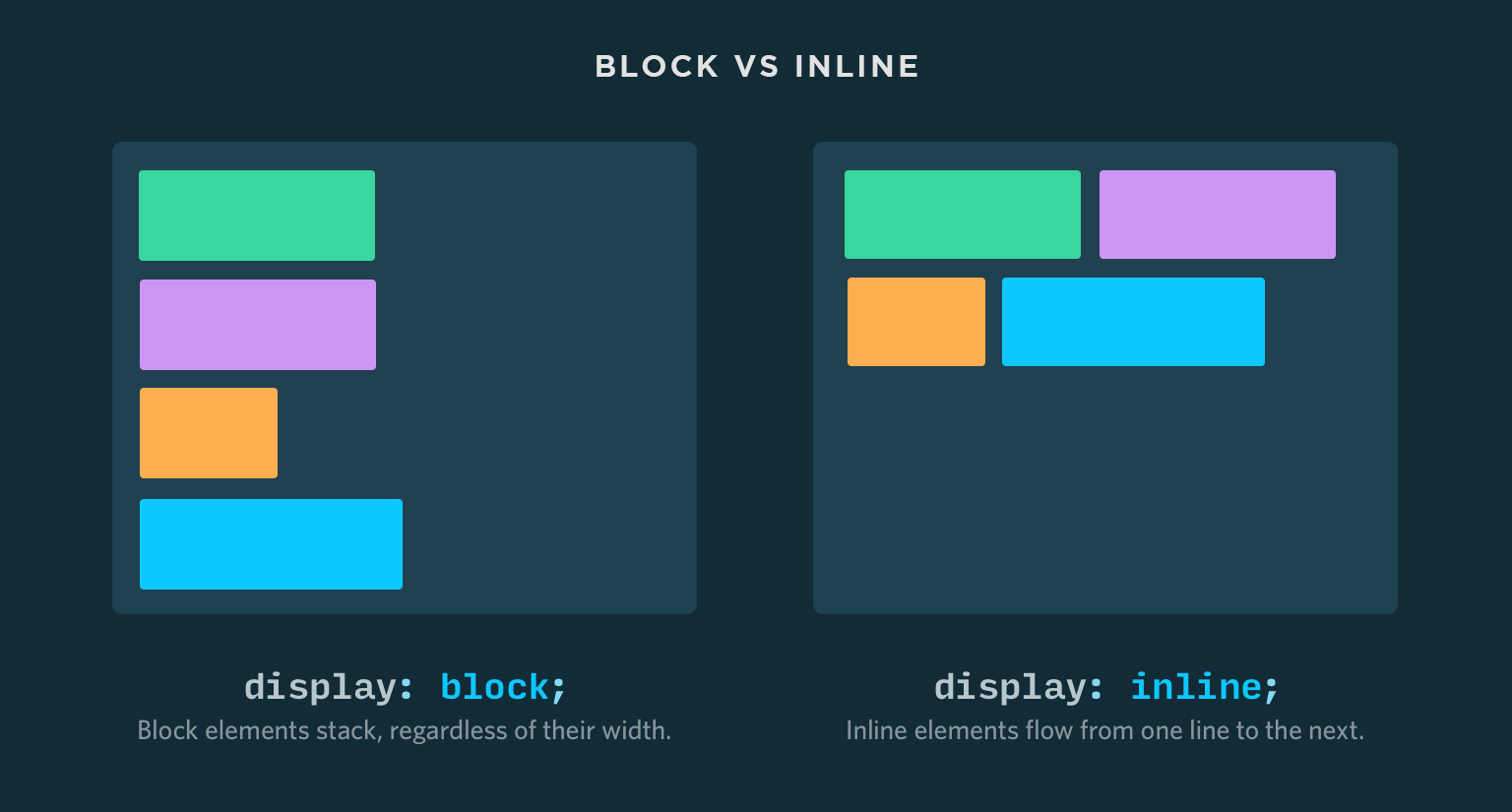 There are three commonly used values for the display property but for now, we’ll just be focusing on two of them: inline and block for the sake of simplicity. To start with, here’s a visual explanation: