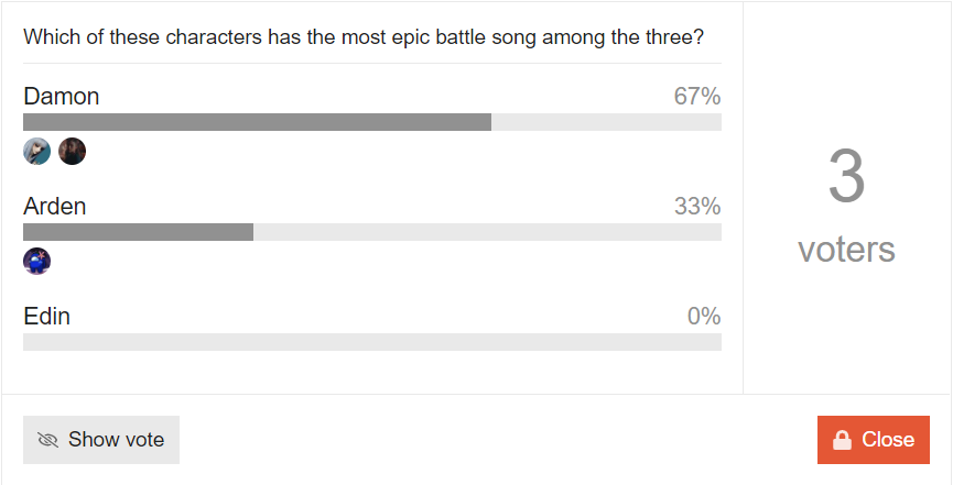 I can understand why they’d vote for Damon. I’m surprised Arden managed to get a vote because her battle song sounds more “unconventional” to me XD