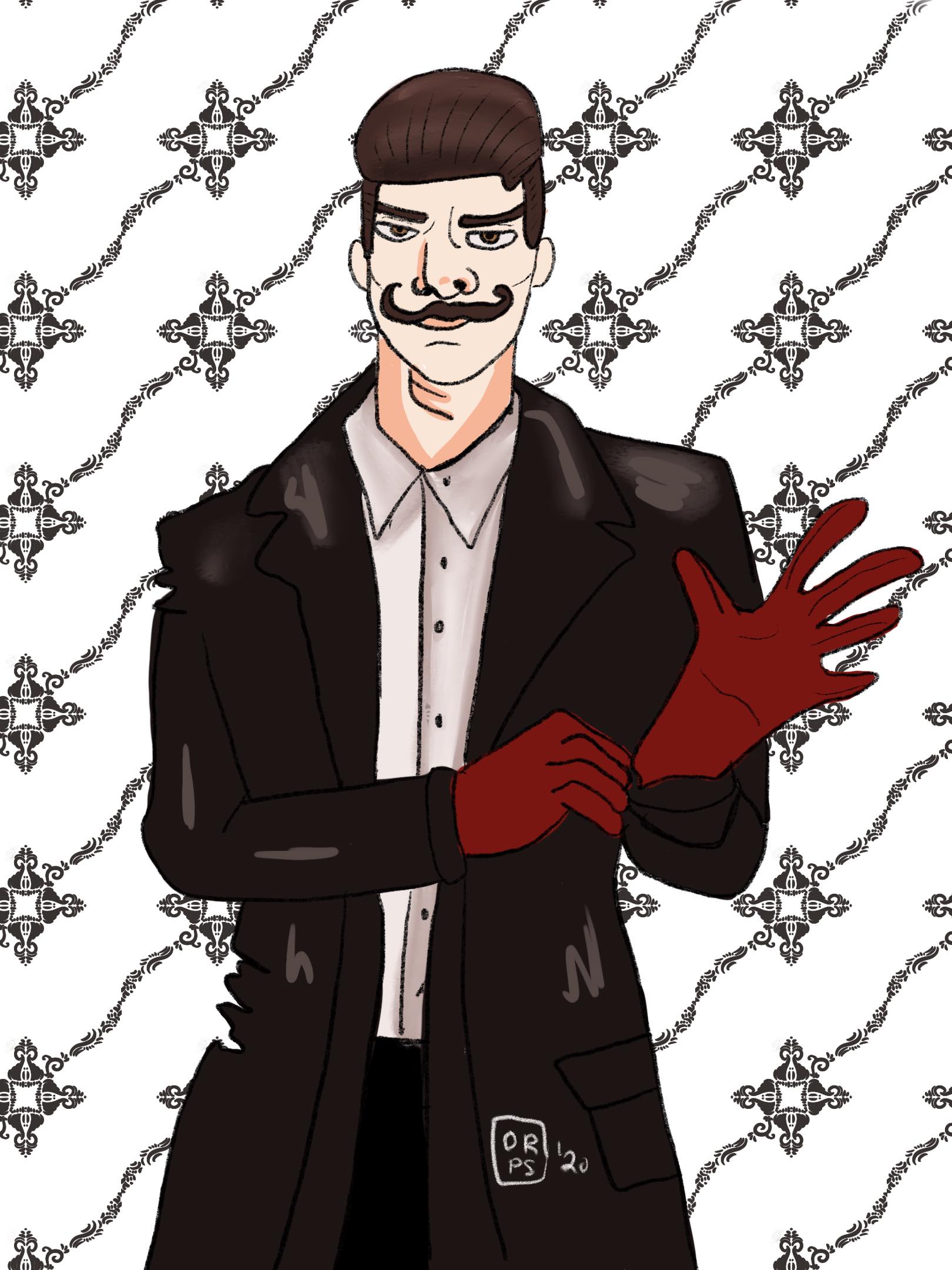 Any particular feature: Brown eyes, dark brown hair, peachy white skin (exactly the drawing above). Handlebar mustache and a smirk. Heās often smirking because he knows heās just so good at what he does. He was born in the late 1790s so the clothes he wears reflects Victorian England often.