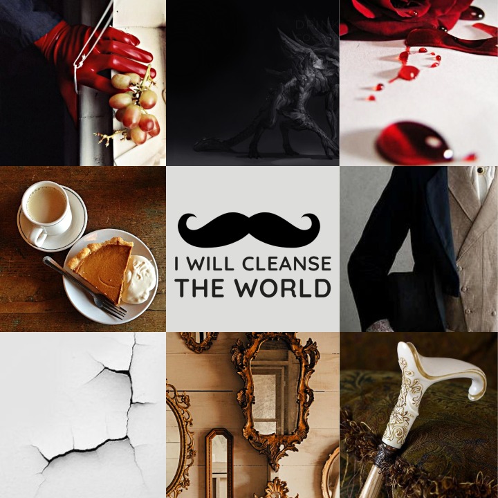 Likes: Blood (you donāt have to include blood if you feel uncomfortable). Well, he also likes black suits with long coattails. Sweet bread, especially the kind with powdered sugar. Pumpkin pie. He likes chocolate. He has a demon companion so adding some suspicious looking shadow on a wall that may or may not look like a reptile-like monster might be good. He likes top hats, bow ties, canes (just for fashion). He likes himself, so a mirror with Victorian vibes might be a nice addition. He likes his handlebar mustache and red gloves because they are the color of blood.