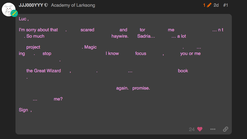 Raza: If they have a reason, do you think they would have shared it with me? My answer would only be speculation. But I do think itās suspicious who advances in their Order and who does not. That being said, yes. I think I have a lead on the book. I found this , I know youāve been looking for scroll pieces, and I happened upon it in the marketplace. However, on the back, was a map leading here. You should start there . I would have shared it sooner, but I wanted to try and get through the path myself, to ease the burden on you all. I havenāt been able to make heads or tails of it. Perhaps you will have more luck than I did.