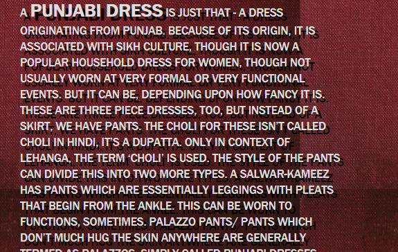 A PUNJABI DRESS IS JUST THAT - A DRESS ORIGINATING FROM PUNJAB. BECAUSE OF ITS ORIGIN, IT IS ASSOCIATED WITH SIKH CULTURE, THOUGH IT IS NOW A POPULAR HOUSEHOLD DRESS FOR WOMEN, THOUGH NOT USUALLY WORN AT VERY FORMAL OR VERY FUNCTIONAL EVENTS. BUT IT CAN BE, DEPENDING UPON HOW FANCY IT IS. THESE ARE THREE PIECE DRESSES, TOO, BUT INSTEAD OF A SKIRT, WE HAVE PANTS. THE CHOLI FOR THESE ISNāT CALLED CHOLI IN HINDI, ITāS A DUPATTA. ONLY IN CONTEXT OF LEHANGA, THE TERM āCHOLIā IS USED. THE STYLE OF THE PANTS CAN DIVIDE THIS INTO TWO MORE TYPES. A SALWAR-KAMEEZ HAS PANTS WHICH ARE ESSENTIALLY LEGGINGS WITH PLEATS THAT BEGIN FROM THE ANKLE. THIS CAN BE WORN TO FUNCTIONS, SOMETIMES. PALAZZO PANTS/ PANTS WHICH DONāT MUCH HUG THE SKIN ANYWHERE ARE GENERALLY TERMED AS PALAZZOS. SIMPLY CALLED PUNJABI DRESSES ARE ONES WITH PANTS THAT FLARE IN THE MIDDLE. THESE DISTINCTIONS ARE NOT HARD AND FAST, JUST COMMONLY USED TERMS. A LOT OF THIS MIGHT ALSO BE SUBJECTIVE BASED ON WHAT I HAVE HEARD AND EXPERIENCED FROM THE PEOPLE AROUND ME. THESE TERMS ALSO GET INTERMIXED A LOT. SO A SALWAR AND A NORMAL PUNJABI DRESS MIGHT BE MIXED UP OR SO ON.
