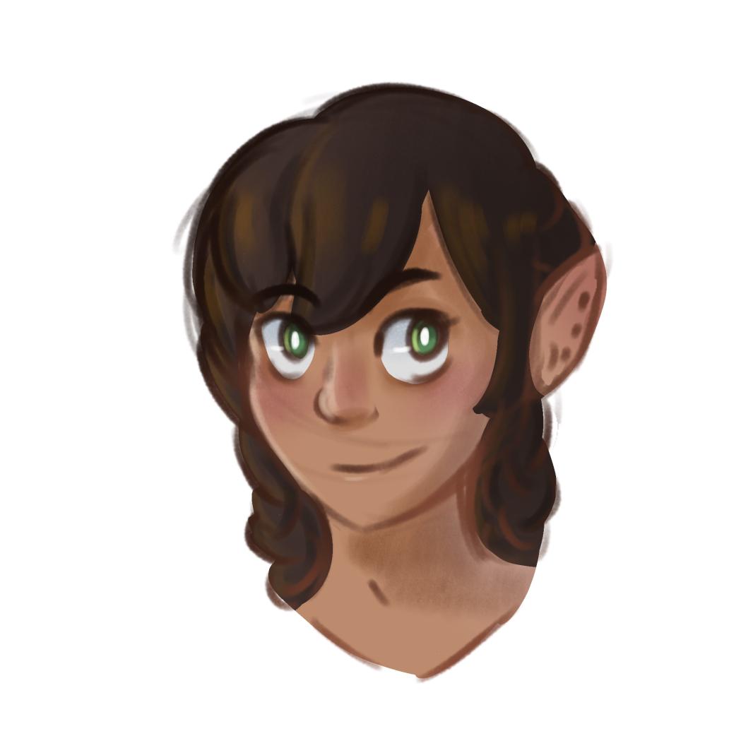MC description: Tanned skin (Close to latin), moss green eyes, elven ears with one ear having three piercings on the top and is clipped (being marked), general outfit is armor but will provide references below, she typically wears a blank expression, and her hair is a dark brown as it is put into two French braids, starting from the front of her hair to the back, will put reference.