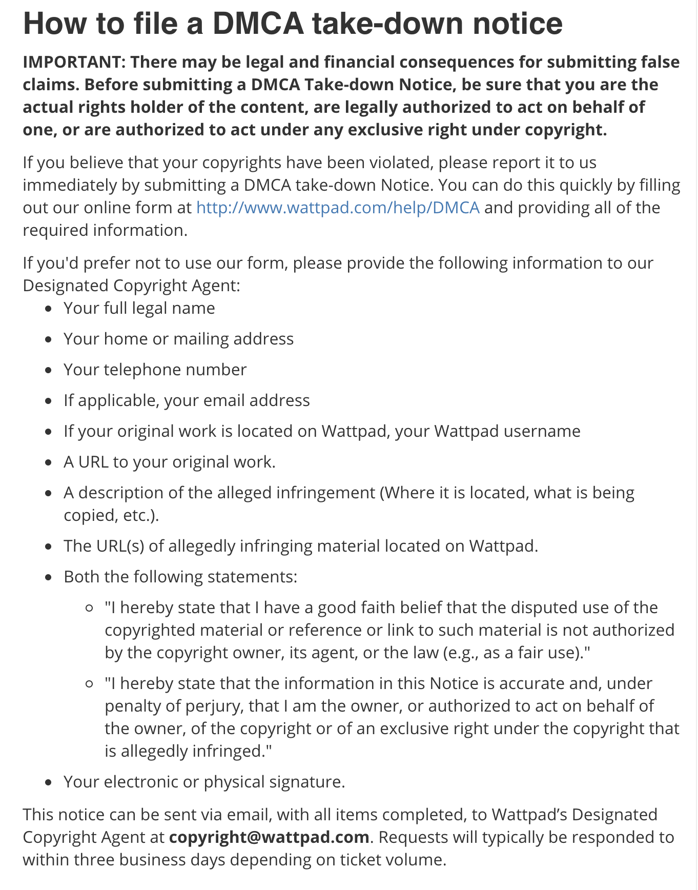 - Proof that the content is yours. This can be anything from an originally posted date on sites like Wattpad or even a creation/modified date in a Word document. Timestamps are critical here. Have the Word/Google document ready to send if they ask for it as proof. Generally, though, just make sure you have the links to your work available where you originally posted it as well as WHEN it was posted.