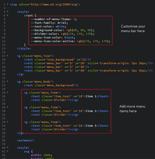 It’s functionally identical to the original but all visible elements can be customised without trawling through the code (see image below) and also supports up to 10 menu items (minimum 1) without the animations distorting.
