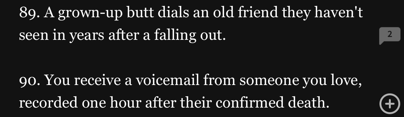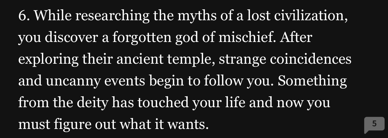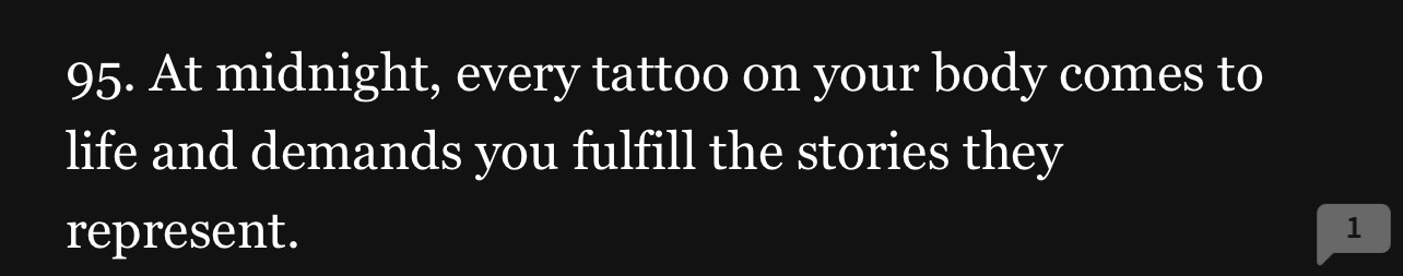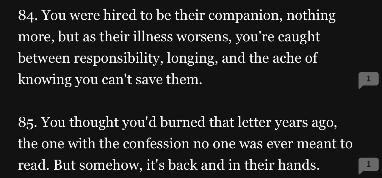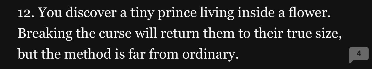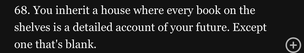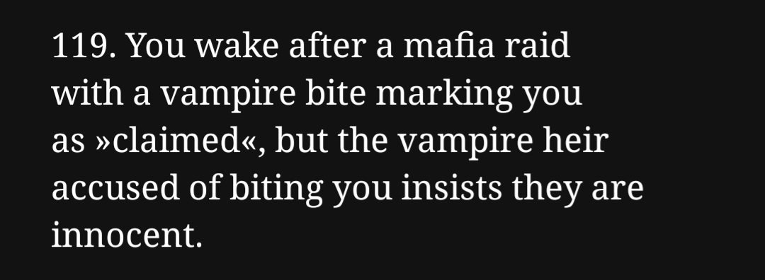 18 would be interesting because you can play a lot of tricks with that one and twists. 19 reminds me of a sorry I stated to write but idk how to name it novella length because it could be long. Unless it’s part one.