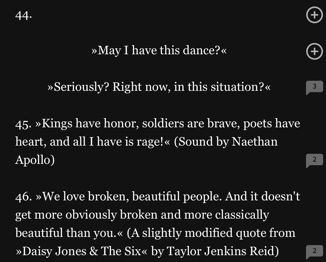 44 would be a dumb club story, 45 is about an angry character and 46 would be a romance, maybe a second chance one.