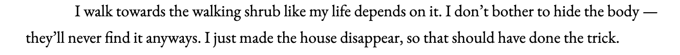 The man tripped over poorly tucked away cloth, small pieces of furniture, had to leap over the bed when she crawled under, the wash stand was knocked over and the porcelain jug shattered upon impact. The whole while, Leena screamed at the top of her lungs, and the madman behind her kept laughing, calling out, “Yell harder, no one can hear you!”