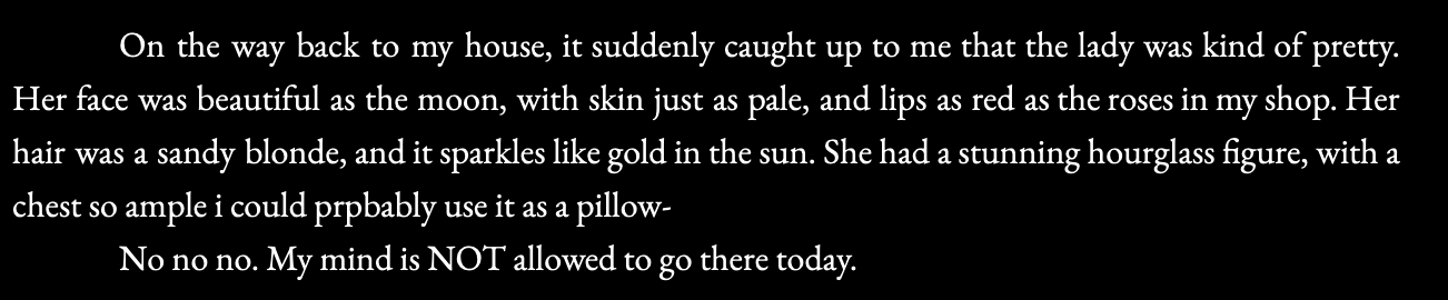 What you wrote is about the level I write when trying to get into the romance bits, so I just felt a nice sense of familiarity ![]()