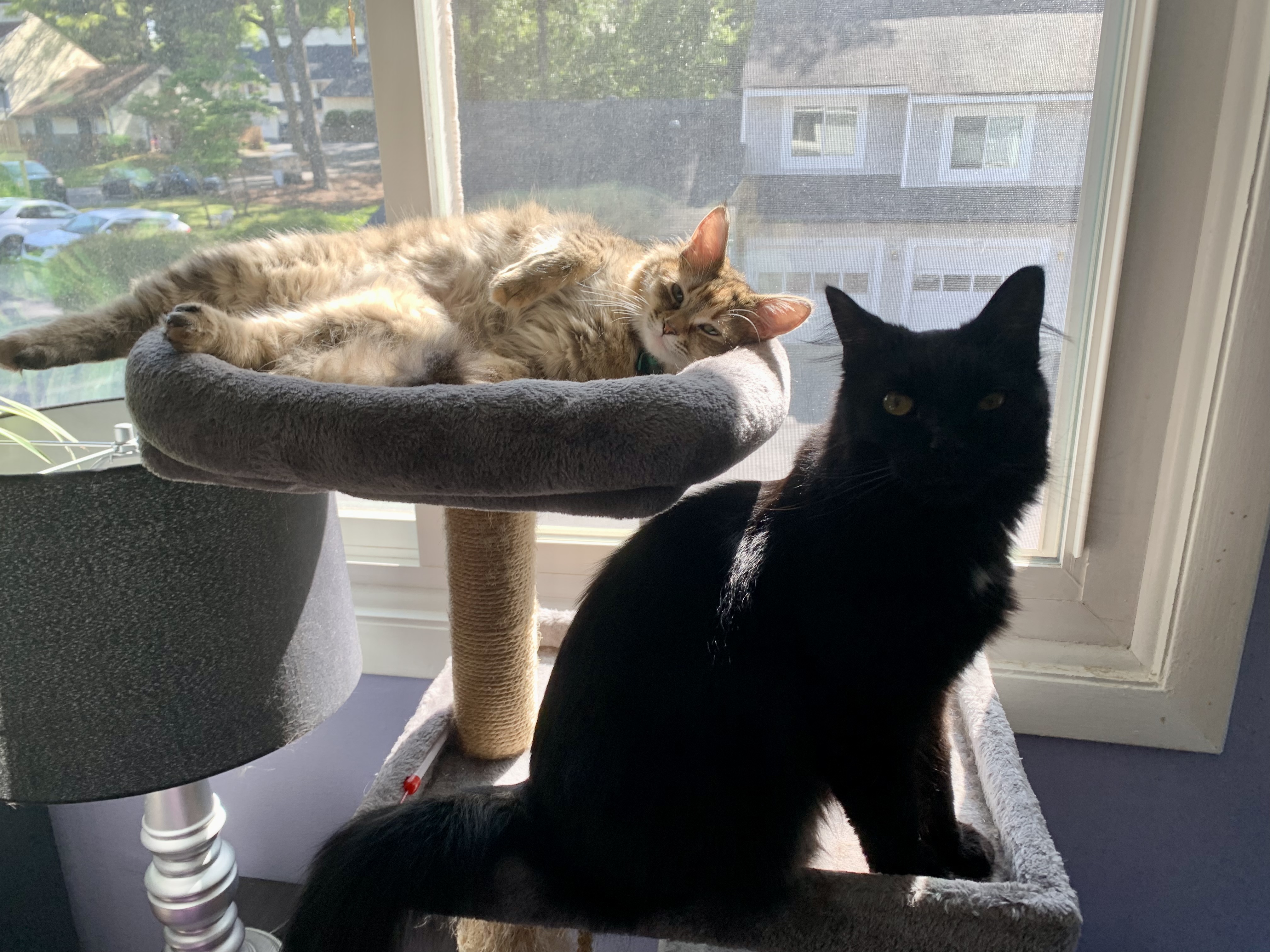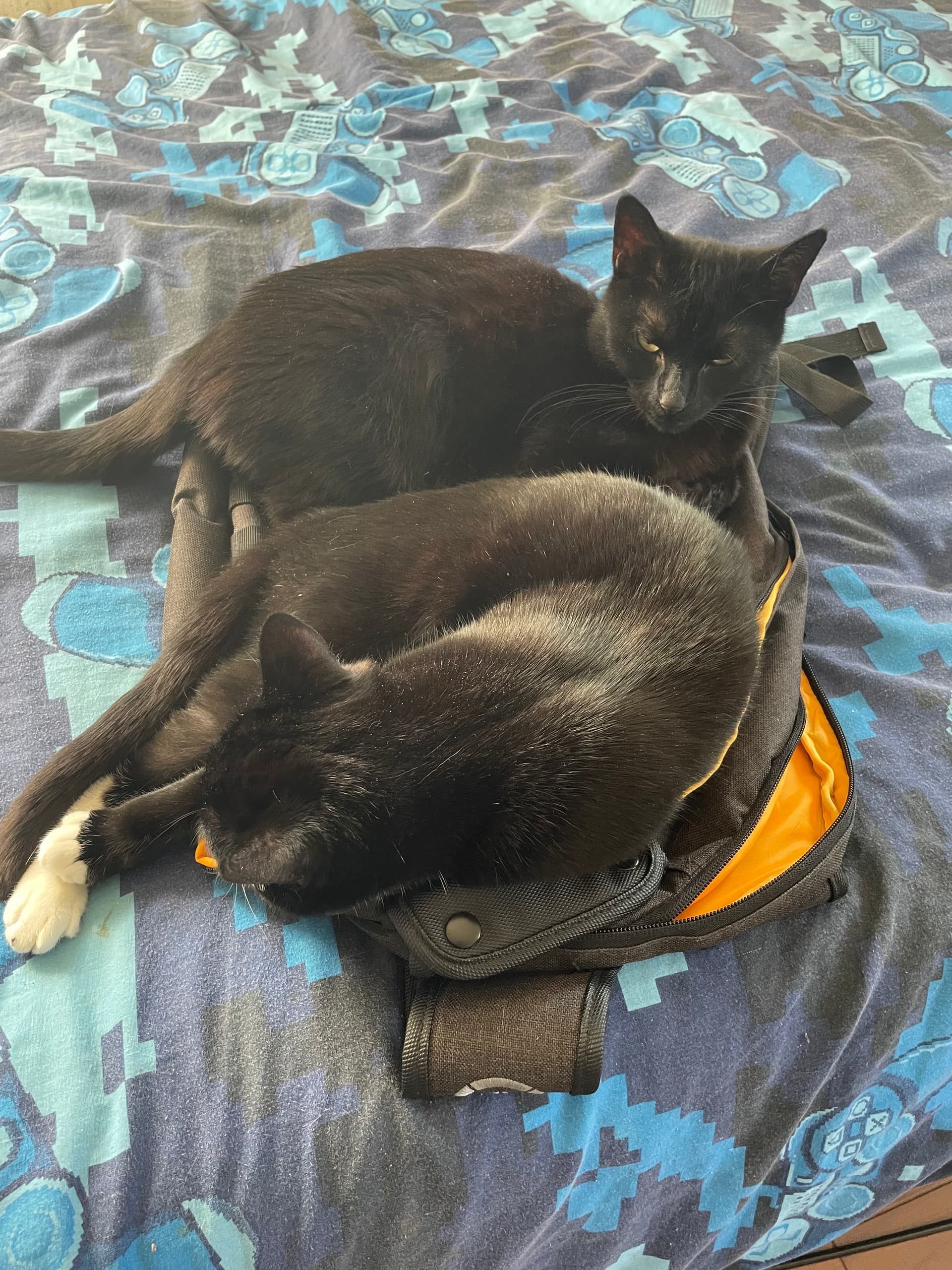 These are my 2 cats. The black/white one always HAS to lie on something - whether it be a plastic bag, a backpack, clothes, blanket… anything. They’re not biological brother/sister but they act like it ![]()