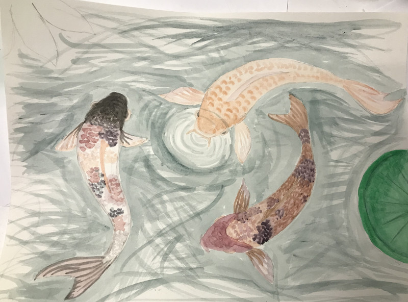 Then I tried my hand at watercolors for the first time in like forty years… I still need to wash it with a brighter blue to sell the Koi feeding there in the middle… but I’m pretty happy with how it came out overall.