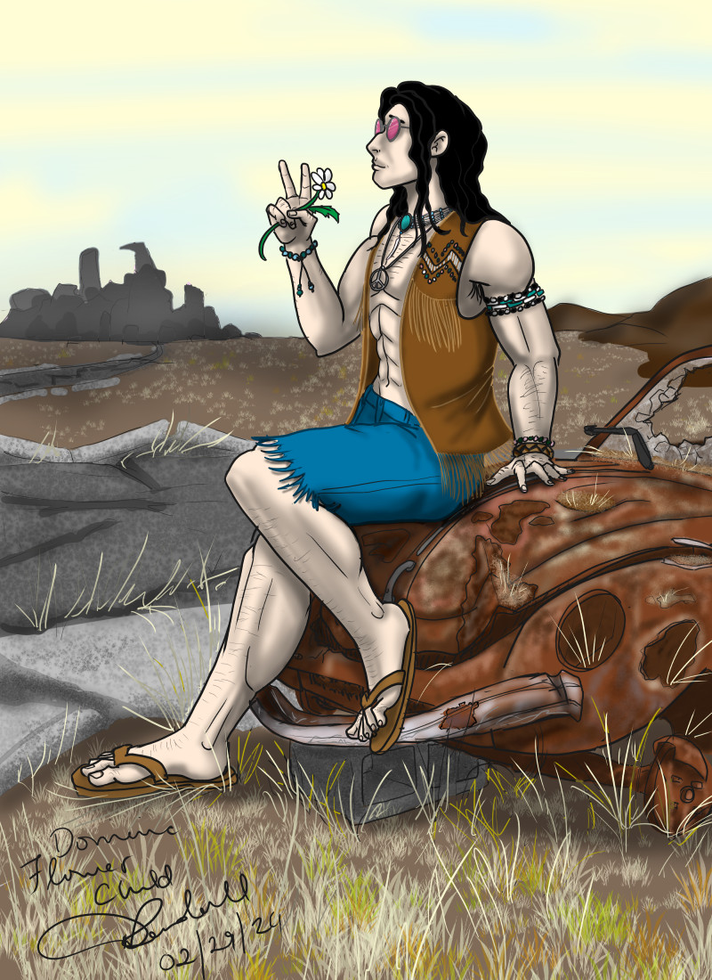 Dominic’s had it! He’s tired of being part of the War Machine! He’s given up his armor and weapons and now wanders the wasteland spreading love and peace to anyone he comes across.