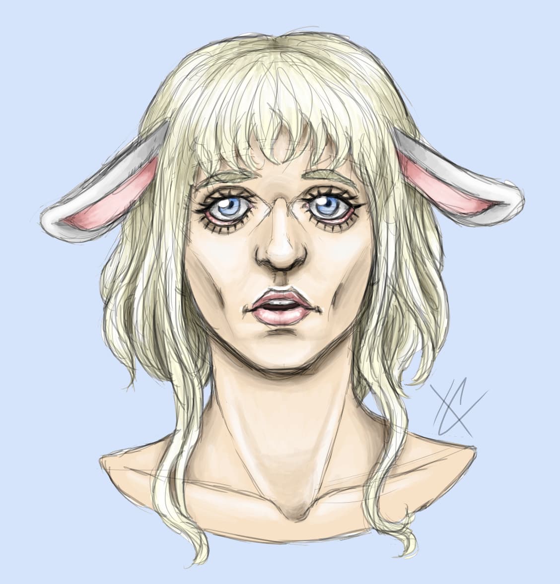Starting a three part art set with My OC’s Arda, Alma, and Errol, with Arda as the lamb, Alma as the shepherd dog, and Errol as the wolf. This is part one, Arda the lamb.
