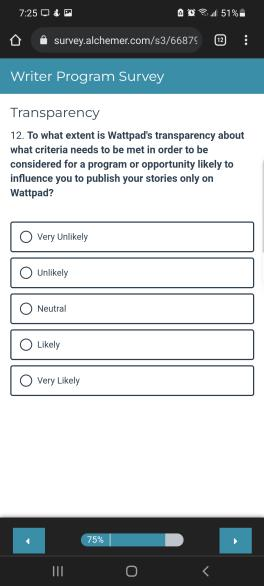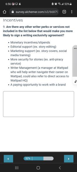 Umm Wattpad I guess sent out a survey to some people (I wasn’t included, but my friend was and she sent me pictures). It’s asking questions like these, and after the whole ONC thing this is giving me a bunch of red flags.
