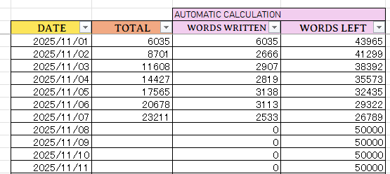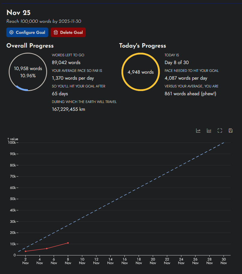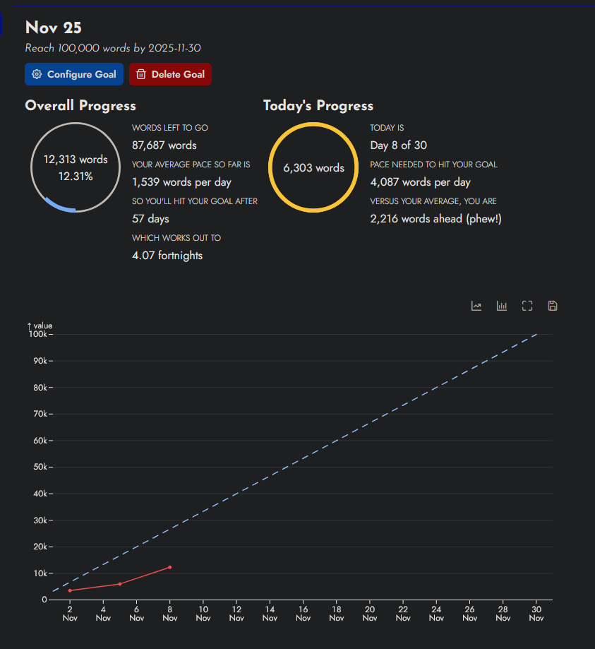 Had a really bad stomach bug make that goal very hard to keep up with. Currently at 8991 words, -795 test words before the month started, being 8196 for the month. Must make 9K to be on track, so I’ve got 804 words to go.